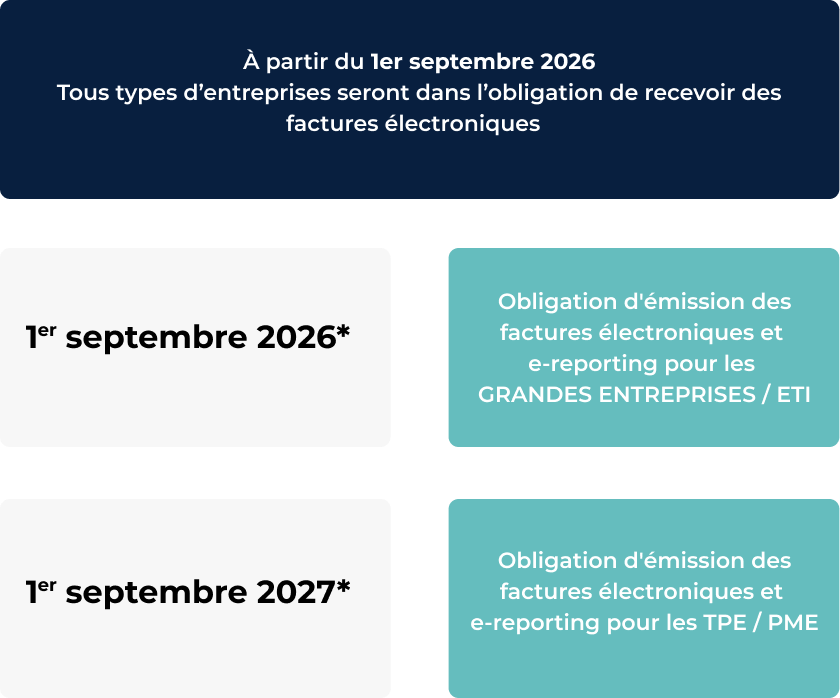 1er septembre 2026 : Généralisation de la facturation électronique rendue obligatoire pour toutes les entreprises assujetties à la TVA en France.